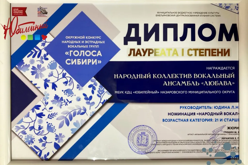 5 апреля в Емельяновском ДК состоялся Окружной конкурс народных и эстрадных вокальных групп «Голоса Сибири». Народный самодеятельный коллектив вокальный ансамбль «Любава» (рук. Любовь Юдина) выступили с успехом и были награждены Дипломом Лауреата I степени. Поздравляем наш талантливый коллектив и руководителя! Желаем новых творческих побед и ярких достижений.