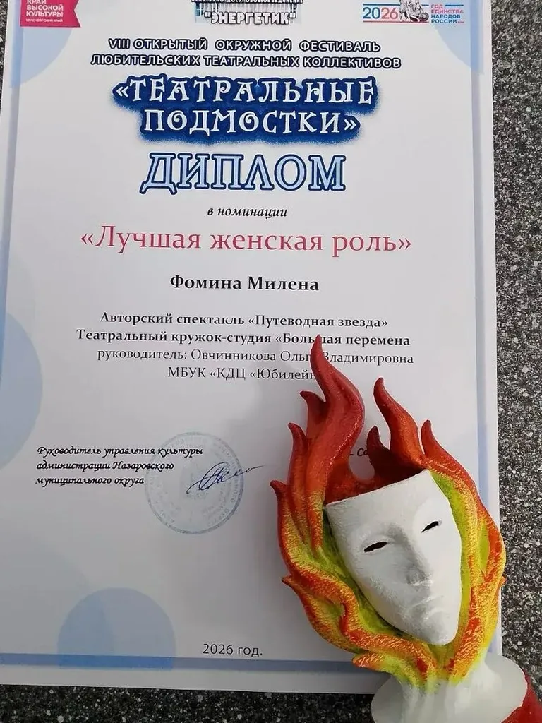 Театральная студия «Большая перемена» (рук. Ольга Овчинникова) представили свой авторский спектакль «Путеводная звезда» и стали лучшими, получив Диплом I степени в старшей возрастной категории. А Фомина Милена покорила жюри своей актёрской игрой и получила награду «За лучшую женскую роль».